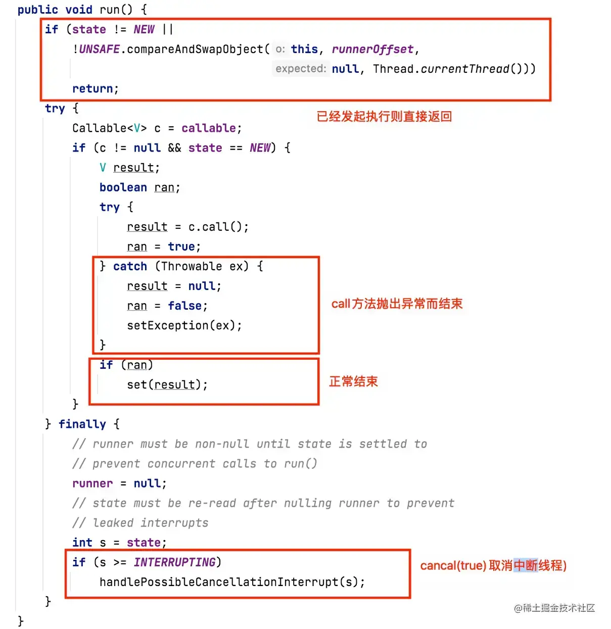 初始时任务的状态为 NEW 和执行任务的线程(runner 字段保存了执行任务的线程)为 null,所以若 run 开始时非 NEW 状态或 runner 非空则说明任务已经被执行或者在执行中,为避免重复发起执行这里会直接返回。