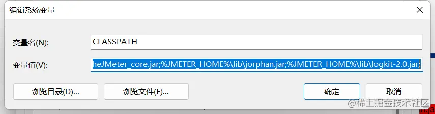 在 CLASSPATH 的值后追加内容:%JMETER_HOME%\lib\ext\ApacheJMeter_core.jar;%JMETER_HOME%\lib\jorphan.jar;%JMETER_HOME%\lib\logkit-2.0.jar; 。