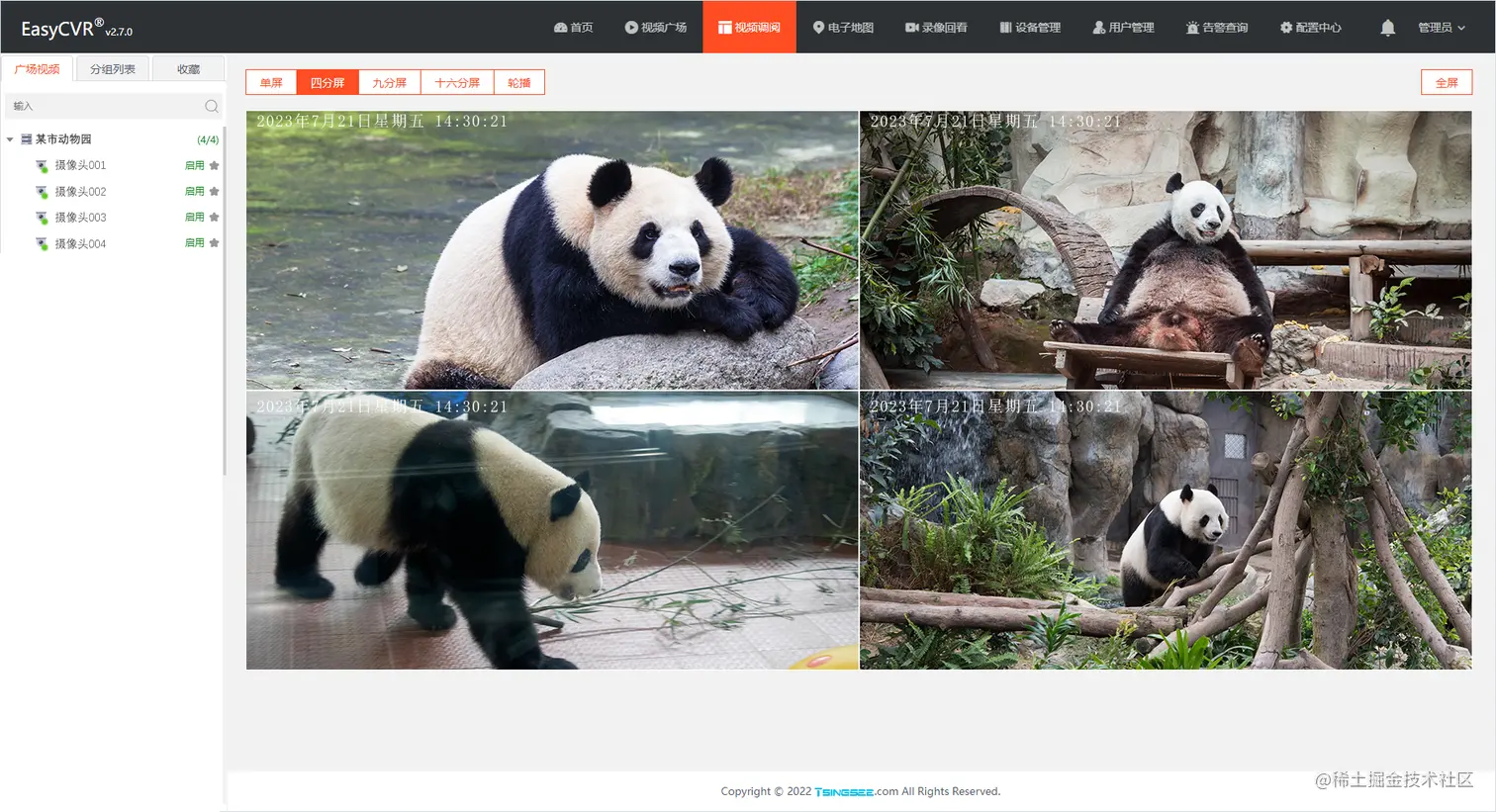 视频平台支持单画面、多画面显示,可选择任意一路或多路视频观看,视频窗口数量1、4、9、16个可选,还支持视频轮巡播放,能观看多场景、多监控摄像头下的大熊猫日常生活状态。