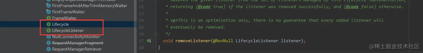 glide 通过添加透明Fragment来监听activity /framgent 生命周期,这里提一下Glide为什么在子线程使用不会去监听生命周期,因为可能会导致内存泄露。在生命周期onDestroy 清理加载请求、onStop加载暂停、onStart恢复图片加载请求,用到了观察者设计模式。与之相关两个接口定义如下