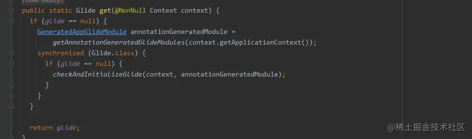 volatile + 双重校验方式 ,确保Glide 在整个应用只有一个实例 。使用volatile 防止指令重排序(new 对象包含分配内存,初始化,引用赋值 三条指令) ,因为可能获得一个未初始化完成的Glide , Glide 引用虽然不为空 ,但是里面的变量因为没有初始化所以可能为null ,这种情况使用就会出问题。双重校验方式确保glide 只能 new 一次。