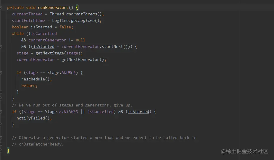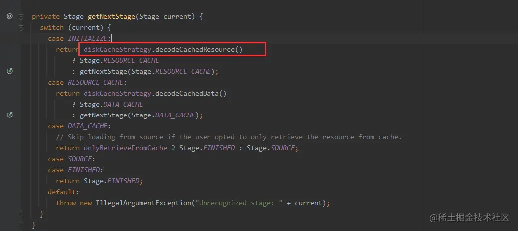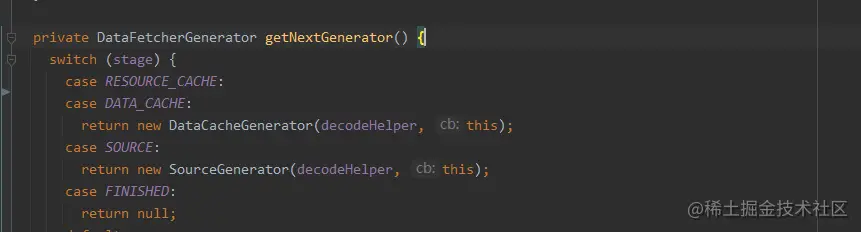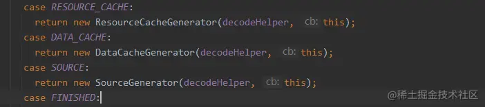 就Glide 而言,将解码请求发送者DecodeJob 高层对象和各种解码具体处理对象ResourceCacheGenerator等解耦,以及具体请求对象之间都通过责任链模式解耦了,DecodeJob作为高层对象无需关注解码细节,只需关注解码的整体流程就行。除了解耦之外还提供良好的扩展性,比如不需要从磁盘缓存中获取已解码的图片缓存, 只需要去掉return new ResourceCacheGenerator就行了,如下。