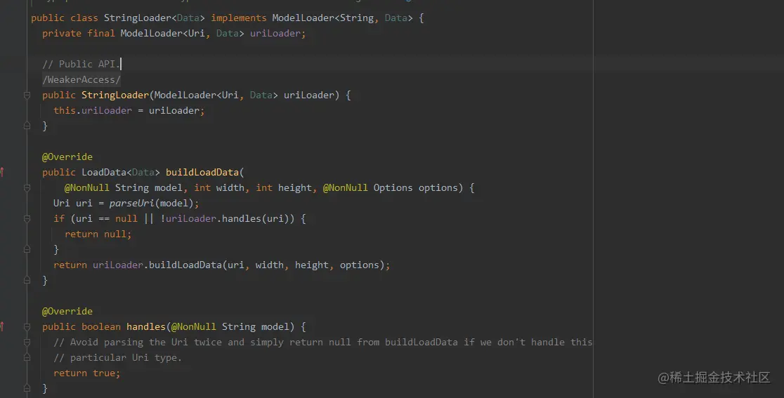Glide 从moedl -> data 这个过程就用到了装饰者设计模式,与之相关的接口是 ModelLoader<Model, Data> 以及实现此接口的子类。假设model 为string情况 ,这种情况对应的有表示网络请求的url ,本地文件 uri ,asset uri ,图片文件路径等,此时ModelLoader 具体实现类为StringLoader。