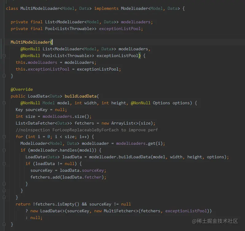 看代码其实就知道并不是这样的,MultiModelLoader只是依赖了各种装饰者的抽象,并没有依赖各个装饰者的具体实现,具体装饰者的代码修改完全不影响MultiModelLoader 。从依赖倒置原则来看,MultiModelLoader 作为client 高层对象依赖抽象ModelLoader ,各个具体装饰者如HttpGlideUrlLoader 也依赖抽象ModelLoader ,MultiModelLoader和HttpGlideUrlLoader通过ModelLoader 抽象实现了依赖倒置。从里氏替换原则来,ModelLoader抽象可以出现的地方,ModelLoader的各种子类装饰者也可以出现在MultiModelLoader中。从迪米特法则和单一职责来看,MultiModelLoader只用于管理统筹多个ModelLoader,不耦合具体实现 。