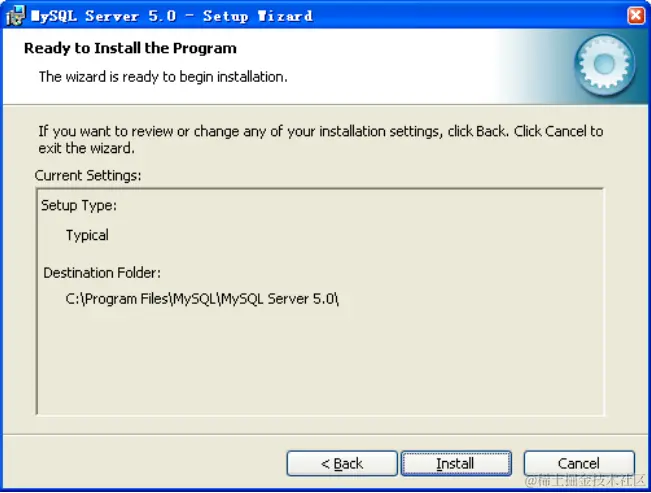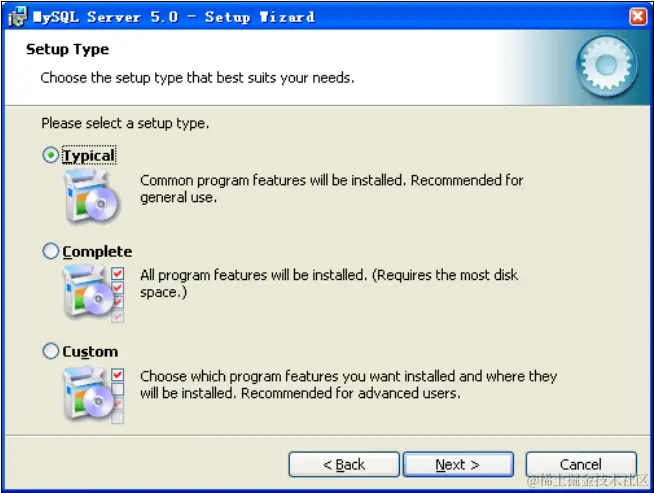 Typical 表 示 一 般 常 用 的 组 件 都 会 被 安 装 , 默 认 情 况 下 安 装 到 c:\Program Files\MySQL\MySQL Server5.0 下,建议大多数情况下选择此安装套件。