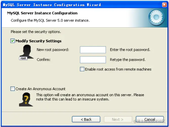 图 1-21 中显示了 MySQL 的两个安全设置复选框,“Modify Security Settings”复选框确定是否修改默认 root 密码,因为默认的 root 密码是空,因此建议用户一定要修改;“Create An Anonymous Account”复选框确定是否创建一个匿名用户,建议用户不要创建,因为这样会给系统带来安全漏洞。这里为了简便起见,将 root 口令改为 123(正式的生产环境中一定要采用更为复杂的密码)。