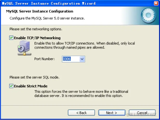 本界面中主要设置 MySQL 服务的端口号,选项“Enable TCP/IP Networking”表示是否运行TCP/IP 连接,而选项“Enable Strict Mode”表示是否采用严格模式来启动服务,至于什么是MySQL 的模式,将在本书的第 16 章中详细介绍。