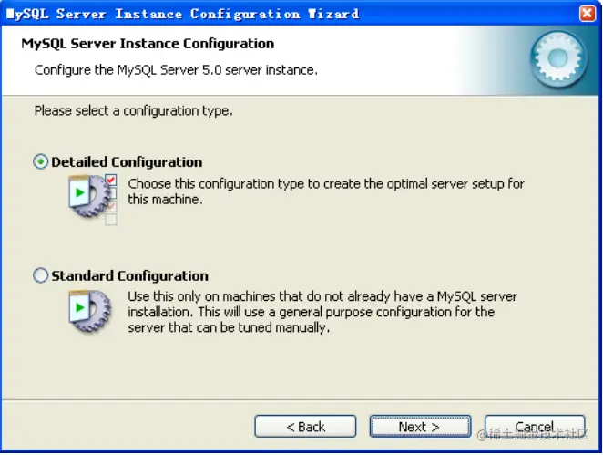 界面中显示了 MySQL 提供的两种配置类型,详细配置(Detailed Configuration)和标准配置(Standard Configuration),它们的区别在于详细配置列出了更详细的个性化配置向导,配置过程相对复杂而且较慢;而标准配置则是一个通用的配置,配置过程简单快速。这里用详细配置为例来进行介绍。