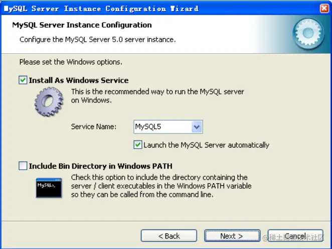 这个界面上部是设置 MySQL 是否作为 Windows 的一个服务,如果是,设置一个服务名称并设置是否 Windows 重启的时候自动装载。这里保留默认选项,将服务名称改为“MySQL5”。下面的“Include Bin Directory in Windows PATH”复选框表示 MySQL 的 Bin 目录是否写入Windows 的 PATH 中,这里选中该复选框。