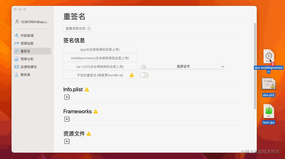 重签名至少需要ipa、证书(cer或p12)、描述文件3个文件,把这3个文件拖入到工具点击重签即可