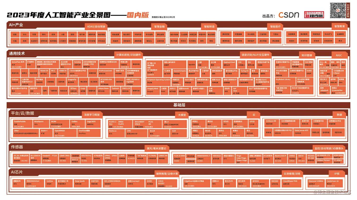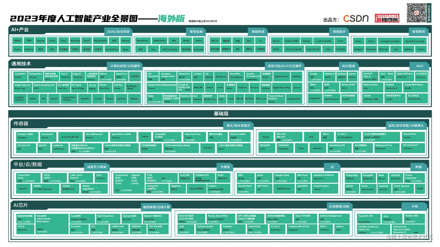 围绕 AI 全产业链,一图呈现国内外 AI 芯片、传感器、平台/模型、云/数据、通用技术、AIGC、应用落地等领域技术生态架构。旨在全方位呈现 AI 技术十年积淀和蜕变,预期未来 AI 产业发展趋势,为从业者带来更多前瞻参考。