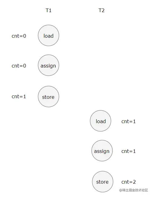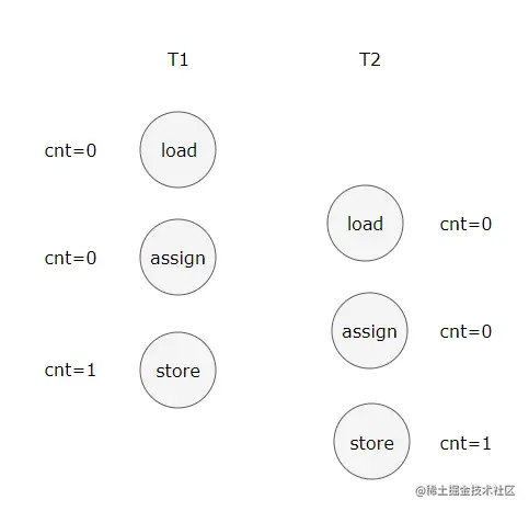 下图演示了两个线程同时对 cnt 进行操作,load、assign、store 这一系列操作整体上看不具备原子性,那么在 T1 修改 cnt 并且还没有将修改后的值写入主内存,T2 依然可以读入旧值。可以看出,这两个线程虽然执行了两次自增运算,但是主内存中 cnt 的值最后为 1 而不是 2。因此对 int 类型读写操作满足原子性只是说明 load、assign、store 这些单个操作具备原子性。
