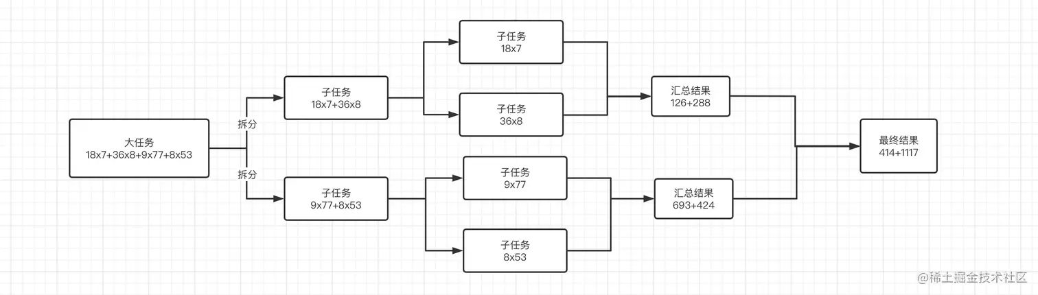 我们来演示一下实际的情况,比如一个算式:18x7+36x8+9x77+8x53,可以拆分为四个小任务:18x7、36x8、9x77、8x53,最后我们只需要将这四个任务的结果加起来,就是我们原本算式的结果了,有点归并排序的味道。