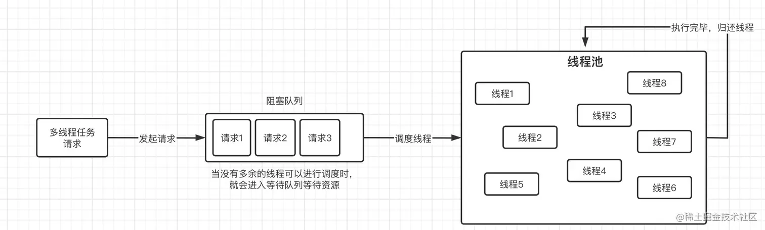 由于线程池可以反复利用已有线程执行多线程操作,所以它一般是有容量限制的,当所有的线程都处于工作状态时,那么新的多线程请求会被阻塞,直到有一个线程空闲出来为止,实际上这里就会用到我们之前讲解的阻塞队列。