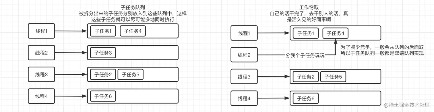 它不仅仅只是拆分任务并使用多线程,而且还可以利用工作窃取算法,提高线程的利用率。