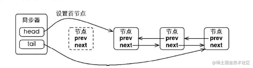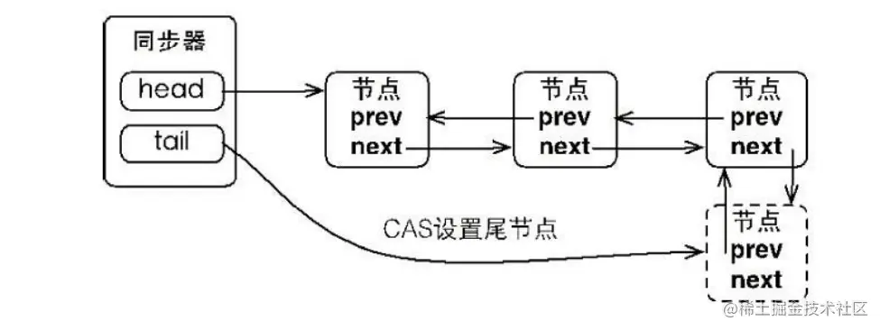 在上图中,同步器包含了两个节点类型的引用,一个指向头节点,而另一个指向尾节点。试想一下,当一个线程成功地获取了同步状态(或者锁),其他线程将无法获取到同步状态,转而被构造成为节点并加入到同步队列中,而这个加入队列的过程必须要保证线程安全,因此同步器提供了一个基于 CAS 的设置尾节点的方法:compareAndSetTail(Node expect,Node update),它需要传递当前线程"认为"的尾节点和当前节点,只有设置成功后,当前节点才正式与之前的尾节点建立关联。