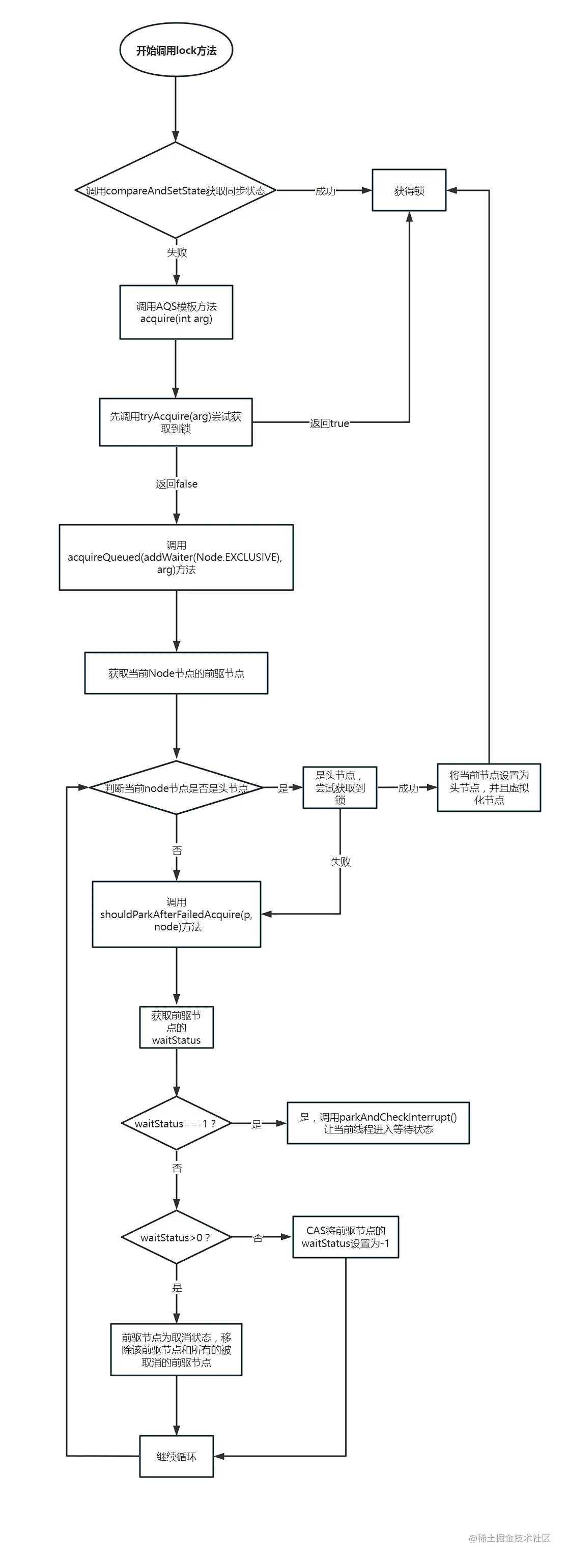 // 说明p为头节点且当前没有获取到锁(可能是非公平锁被抢占了)或者是p不为头结点,这个时候就要判断当前node是否要被阻塞(被阻塞条件:前驱节点的waitStatus为-1),防止无限循环浪费资源。具体两个方法下面细细分析