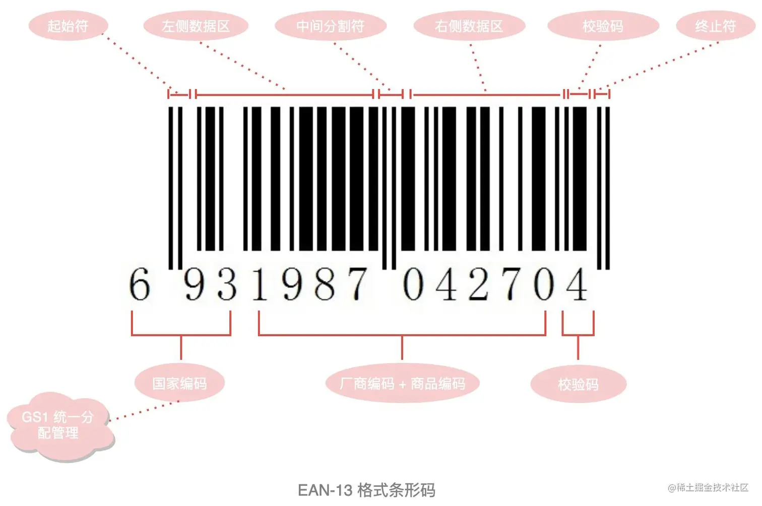 中国使用的条形码大部分都是 EAN-13 格式的,条形码数字编码的含义从左至右分别是前三位标识来源 国家编码 ,比如中国为:690–699,后面的 4 ~ 8 位数字代表的是厂商公司代码,但是位数不是固定的,紧接着后面 的 9~12 位是商品编码,第 13 位是校验码,这就意味着公司编码越短,剩余可用于商品编码的位数也越多,可表示的商品也就越多,当然公司代码出售价格也相应更昂贵,另外用在商品上的 EAN-13 条码是要到 国家物品编码中心去申请的。