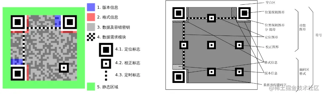 数据和纠错码字:实际保存的二维码信息,和纠错码字(用于修正二维码损坏带来的错误)