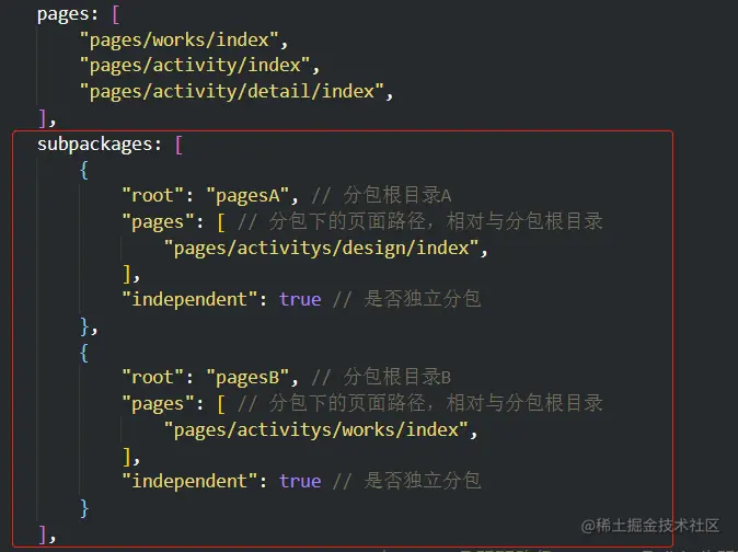 开发者通过在app.json的subpackages字段中对应的分包配置项中定义independent字段声明对应分包为独立分包(上图已备注)