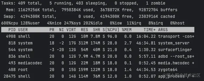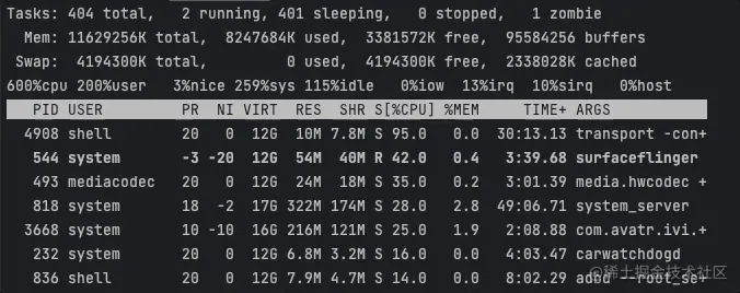 耗时任务基本聚集在CPU0和CPU1上执行,此时CPU峰值约为193 / 600 % 。