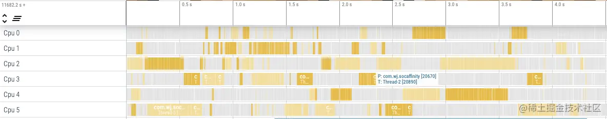 该场景下,我们不做额外操作,线程调度采用Android内核默认的方式,得到如下结果: