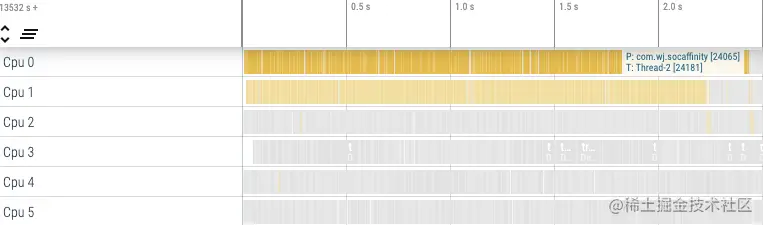 该场景下,我们使用ThreadAffinity将应用进程绑定CPU5上(在我的设备上CPU4、CPU5都是小核心)。