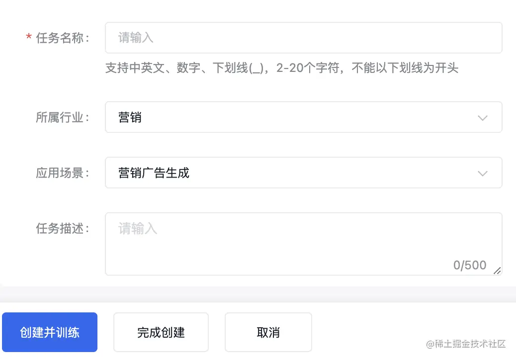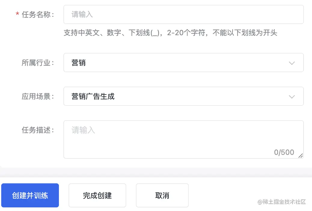 创建并训练[创建并训练])直接开启训练模型的运行配置界面;“完成创建” 仅创建任务不创建训练模型的运行。
