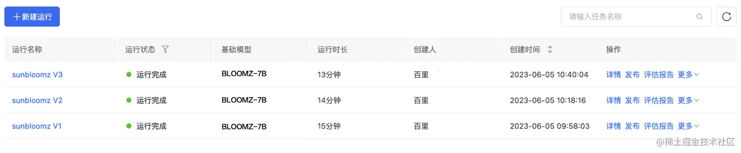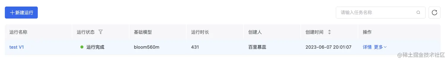 在[大模型调优]的详情页,即可查看训练运行的列表。此界面可[新建运行]。