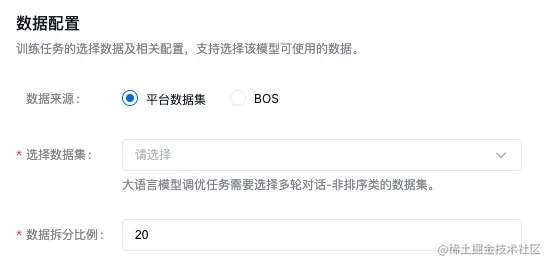 当预置模型选择 BLOOMZ-7B 时,需要设置数据拆分比例。比如设置 20,则表示选定数据集版本总数的 80% 作为训练集,20% 作为验证集。