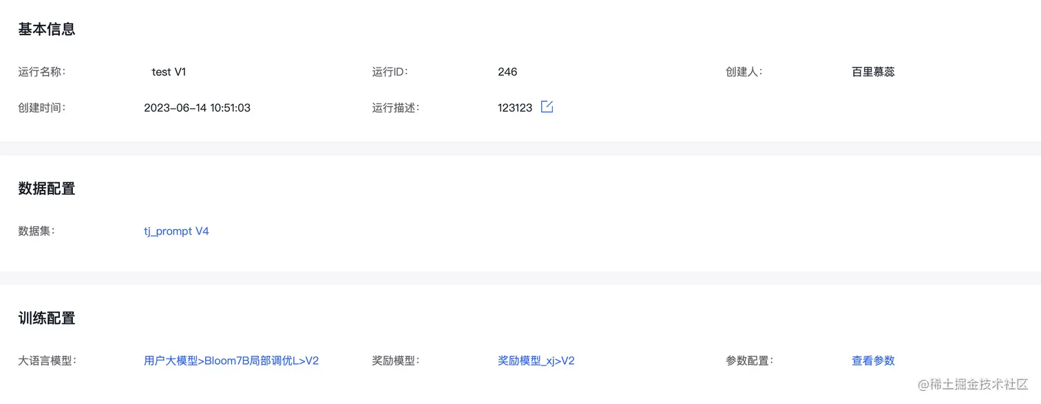 在运行任务的详情页可查看创建运行时的基本信息、训练配置和数据配置,详情数据的来源为[新建运行]时填入的内容。