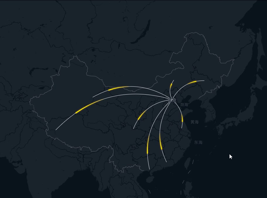 飞线是地图类组件常用的一种效果,往往由一条底线和一条不断移动的曲线构成,当然底线也是可以去掉的,这里展示底线是为了让大家更直观得看到飞线的完整轨迹。