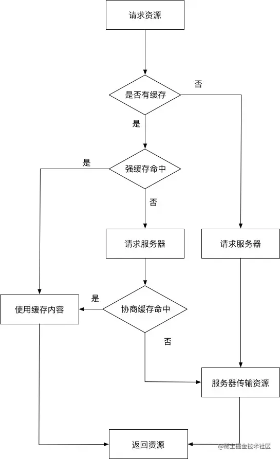 浏览器首次发送请求时,通过响应头的标识来确定缓存类型。再次请求时,先判断是否有强制缓存、协商缓存。具体过程,如图: