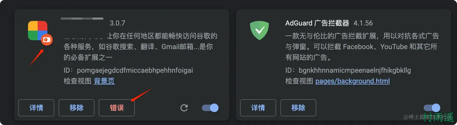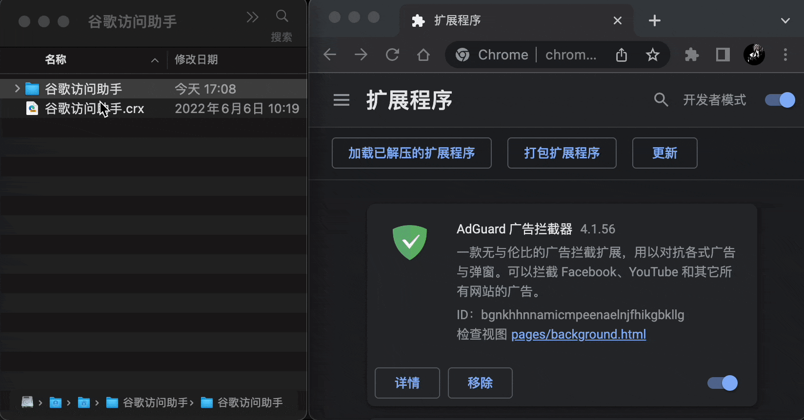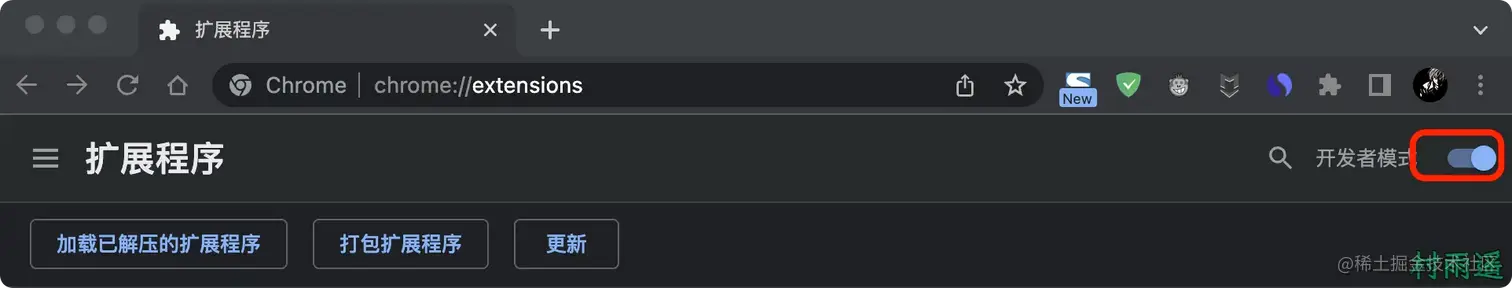 不过在那之前,需要先把浏览器扩展程序中的开发者模式打开。