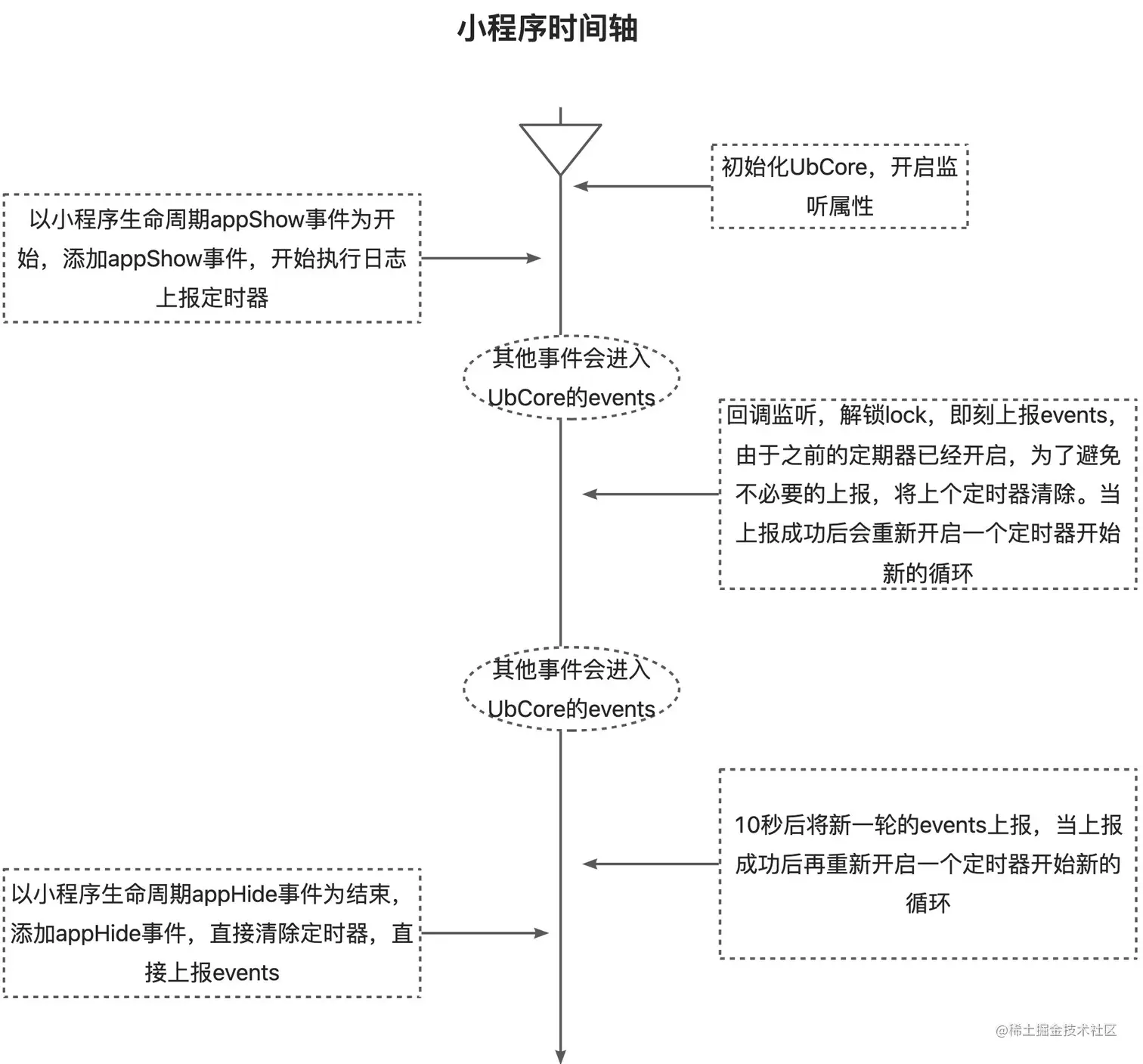 - 上报时机:小程序appShow事件是所有事件的开始 ,所以从这里开启定时器;appHide清除定时器,直接上报。