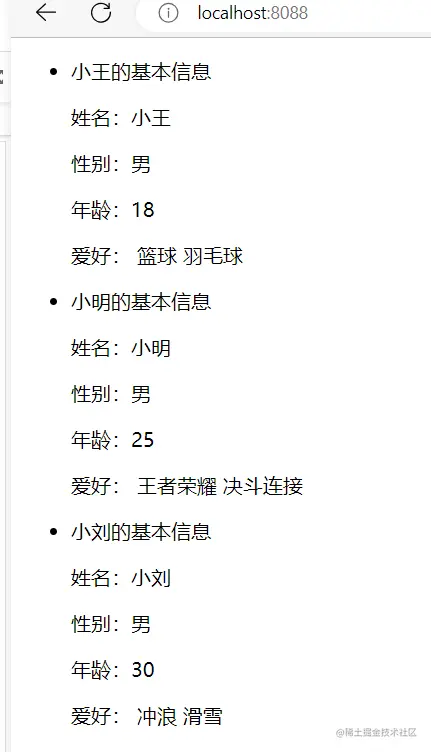 { name: "小王",sex: "男",age: 18,hobbies:["篮球","羽毛球"]},