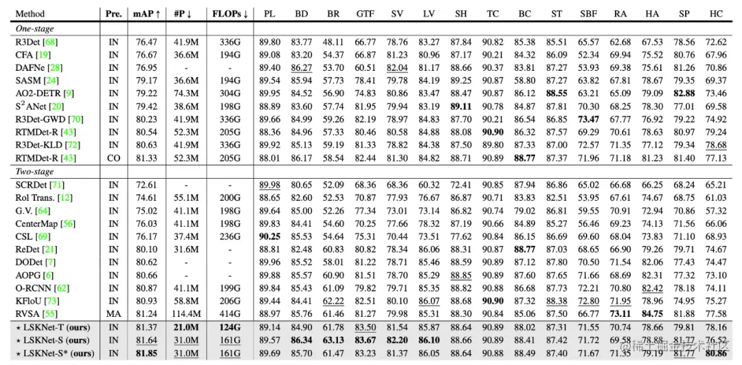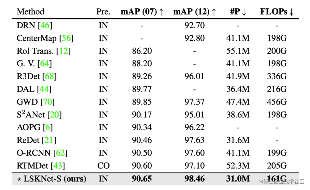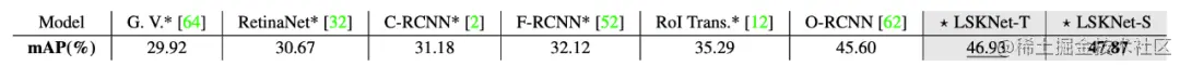▲ 表2. 在DOTA-v1.0的O-RCNN框架下,LSKNet-S和其他(大核/选择性注意)骨干的比较,除了Prev Best是在RTMDet下。所有骨干网都在ImageNet上进行了100次预训练。我们的LSKNet在类似的复杂度预算下实现了最佳的mAP,同时超过了之前的最佳公开记录。