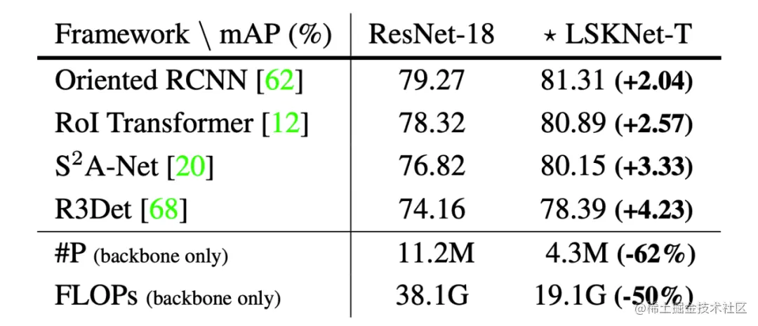 ▲ 表1. LSKNet-T和ResNet-18作为骨干网在DOTA-v1.0上的不同检测框架的比较。LSKNet-T骨干网在ImageNet上进行了100次预训练。与ResNet-18相比,轻量级的LSKNet-T在各种框架中取得了明显更高的mAP。