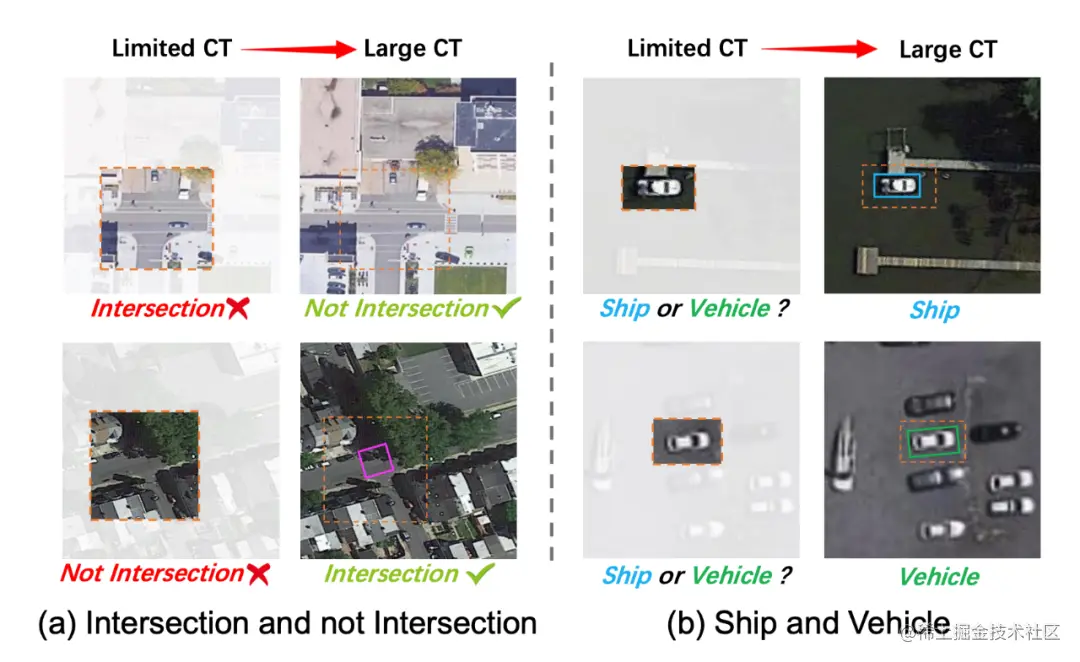 如图 1(a) 所示,遥感图像中的物体检测器所使用的有限范围的背景往往会导致错误的分类。例如,在上层图像中,由于其典型特征,检测器可能将T子路口归类为十字路口,但实际上,它不是一个十字交路口。同样,在下图中,由于大树的存在,检测器可能将十字路口归类为非路口,但这也是不正确的。这些错误的发生是因为检测器只考虑了物体附近的有限的上下文信息。在图 1(b) 中的船舶和车辆的例子中也可以看到类似的情况。