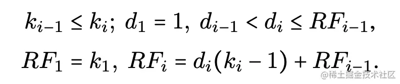 根据 Introduction 中所说的先验(2),建议对一系列的多个尺度的背景进行建模,以进行适应性选择。因此,我们建议通过明确地将其分解为一连串具有大的卷积核和不断扩张的 depth-wise 卷积来构建一个更大感受野的网络。其序列中第i个深度卷积的核大小 k、扩张率 d 和感受野 RF 的扩展定义如下: