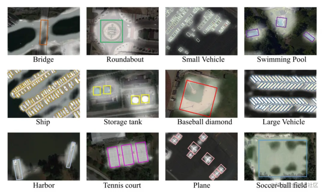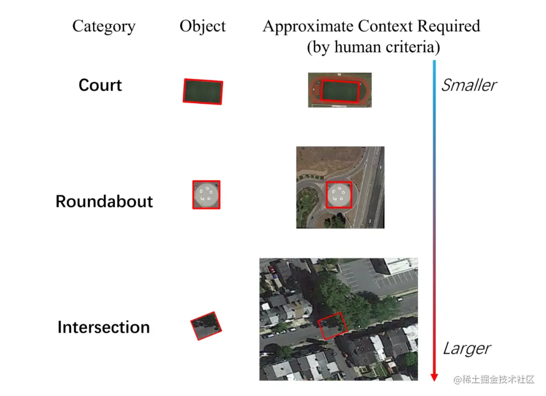 如图 2 所示,在遥感图像中进行准确的物体检测所需的背景信息量会因被检测物体的类型而有很大不同。例如,足球场可能需要相对较少的额外环境信息,因为它有独特的可区分的球场边界线。