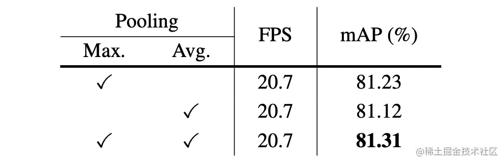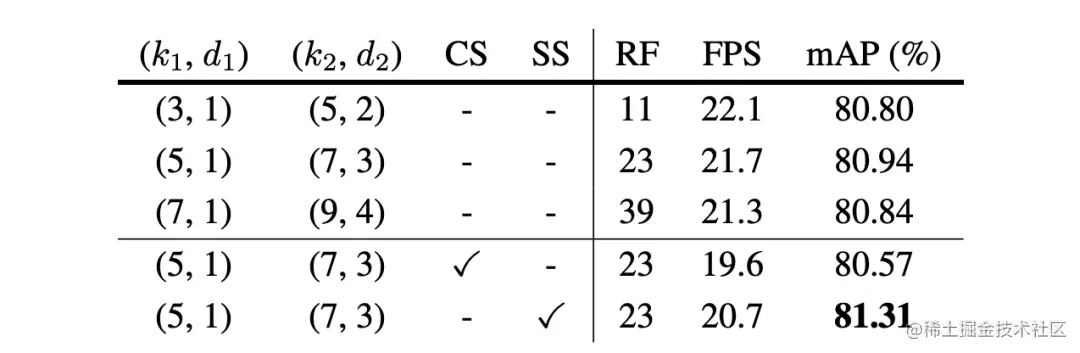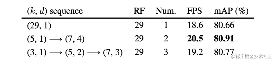 ▲ 表6. 分解的大核的数量对推理的FPS和mAP的影响,给定的理论感受野是29。将大核分解成两个深度方向的核,实现了速度和精度的最佳表现。