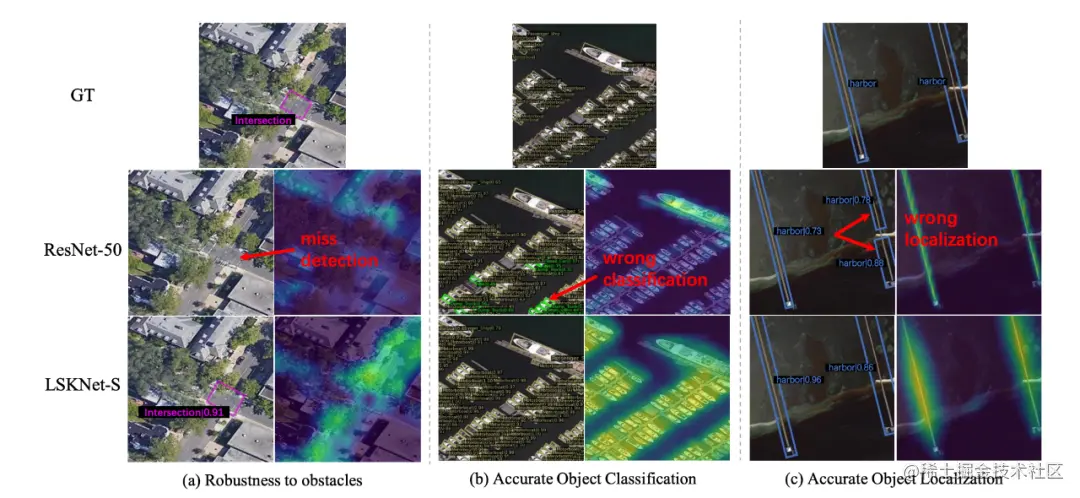 ▲ 图5. 使用ResNet-50和LSKNet-S的O-RCNN检测框架的Eigen-CAM可视化。我们提出的LSKNet可以对长范围的上下文信息进行建模,从而在各种困难的情况下获得更好的性能。