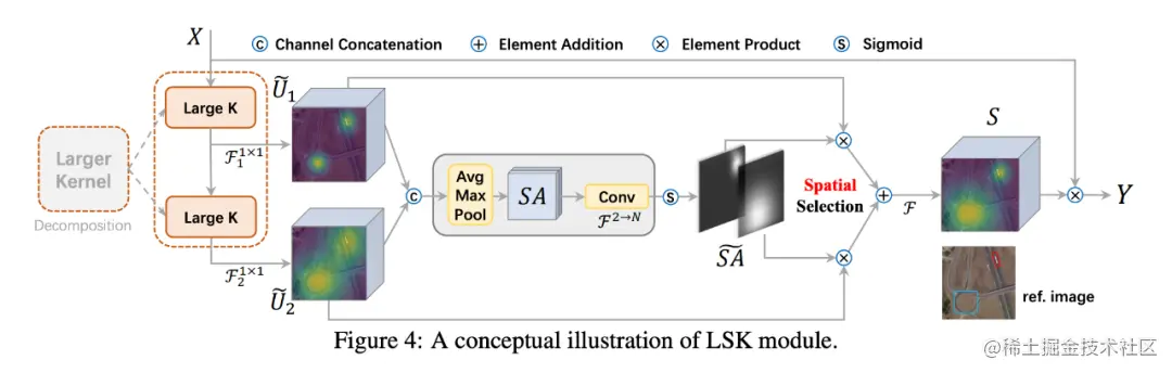 所提出的设计有两个优点。第一,它明确地产生了具有各种大感受野的多个特征,这使得后来的内核选择更加容易。第二,顺序分解比简单地应用一个较大的核更有效更高效。为了提高网络关注检测目标的最相关的空间背景区域的能力,我们使用了一种空间选择机制,从不同尺度的大卷积核中空间选择特征图。图 4 显示了 LSK 模块的详细概念图,在这里我们直观地展示了大选择核是如何通过自适应地收集不同物体的相应大感受野而发挥作用的。