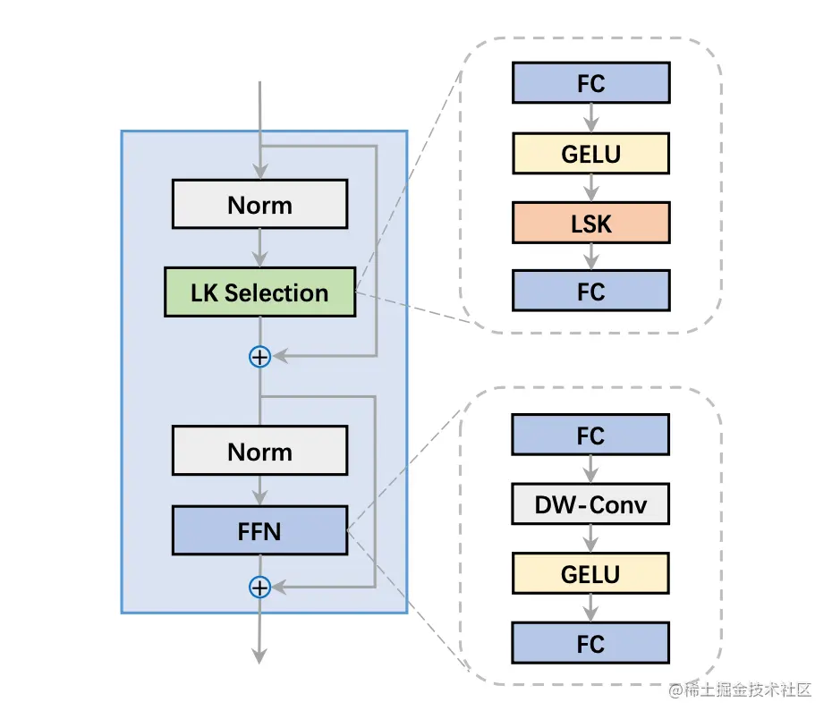 图 3 展示了一个 LSKNet Bolck 的图示,是主干网中的一个重复块,其灵感来自 ConvNeXt, PVT-v2, VAN, Conv2Former 和 MetaFormer。每个 LSKNet 块由两个剩余子块组成:大核选择(LK Selection)子块和前馈网络(FFN)子块。LK 选择子块根据需要动态地调整网络的感受野。前馈网络子块用于通道混合和特征细化,由一个全连接层、一个深度卷积、一个 GELU 激活和第二个全连接层组成的序列。核心模块 LSK Module(图 4)被嵌入到 LK 选择子块中。它由一连串的大内核卷积和一个空间内核选择机制组成。