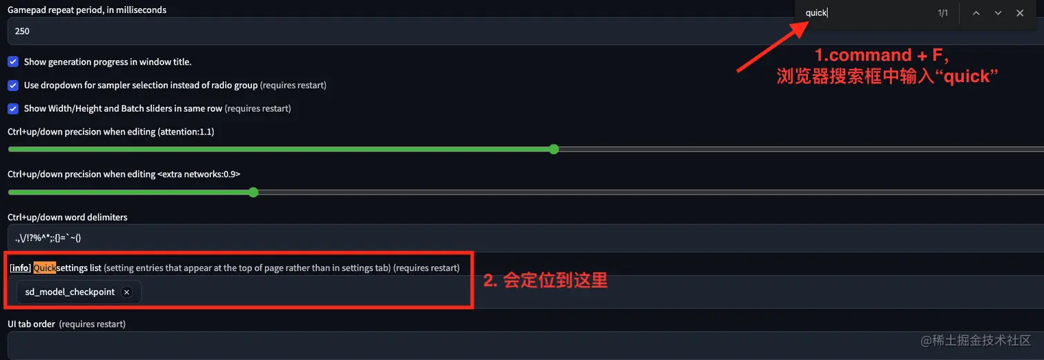 配置比较多,不太容易找。所以在浏览器中搜 “quick”,会定位到Quicksettings list这一配置。在这一栏中,目前只有 “sd_model_checkpoint”,也就是大模型,所以在我们在界面上只有大模型的下拉框。