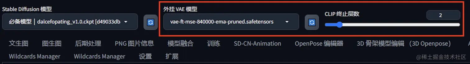 发现 VAE、Clip skip 已经显示在 Stable Diffusion WebUI 上了。