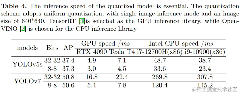 可以看出,加速效果非常显著,特别是对于较大的YOLOv7模型,在使用GPU时,速度提升比超过了3倍,与全精度模型相比。这表明在实时检测器中应用量化可以带来显著的加速效果。 :::