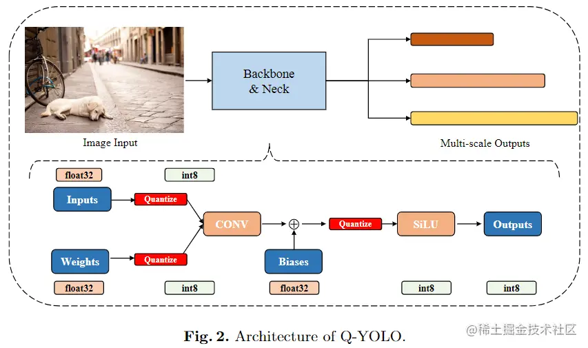 其中,量化是用的比较多且成熟的技术。而在量化方法中,有两种常见的方法,分别是量化感知训练(QAT)和训练后量化(PTQ)。虽然 QAT 通常比 PTQ 获得更好的结果,但在量化过程中需要对所有模型参数进行训练和优化,因此需要预训练数据和显著的 GPU 资源,使得 QAT 的执行变得具有挑战性【其实就是繁琐】。相反,PTQ 是一种更高效的实现实时目标检测器量化的方法。因此 Q-YOLO 便后量化操作的。
