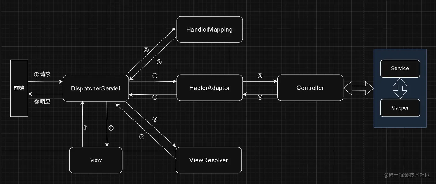 - Controller调用服务层以及数据持久层,将前端请求的响应结果返回给HandlerAdaptor然后再返回给DispatcherServlet这个前端控制器;